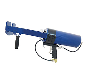 Aluminum air cylinder is 4” diameter. Has “air in” and “air out”. This provides power forward and power reverse for ease of operation. Supplied with built in air regulator at base of handle. Comes with interchangeable side handle for added stability.